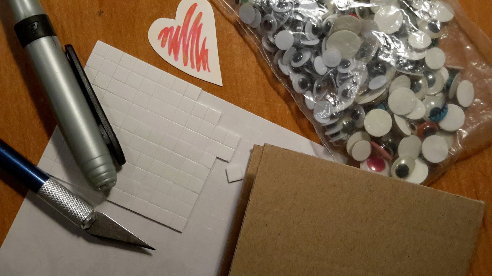 Po wklejeniu oka w otworze - w środku dorysowujemy postać. U mnie jest to słodki potworek. Dodałam także serce.